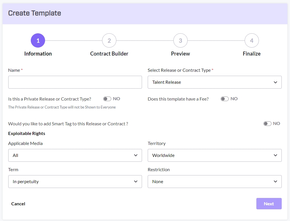 Once you’ve finished adding your basic release information, click Next at the bottom right to move to the contract builder.