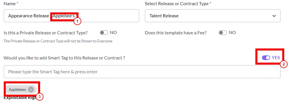 Example: duplicate your Master Appearance Release document, rename it (e.g., "Appearance Release - Applebee’s Scene"), type the Smart Folder Tag, then press ENTER to attach it (it appears as a gray button).