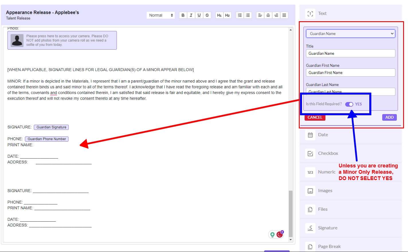 If you have a guardian clause, add guardian information, but do NOT make it mandatory unless the contract is for minors only.